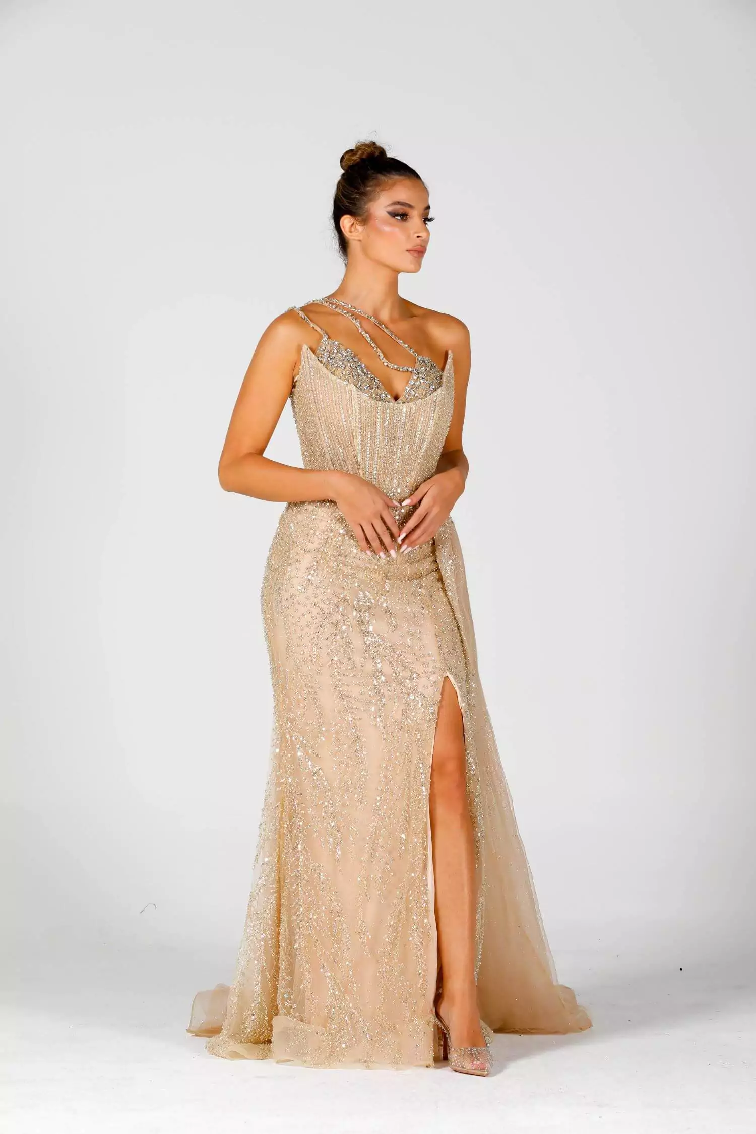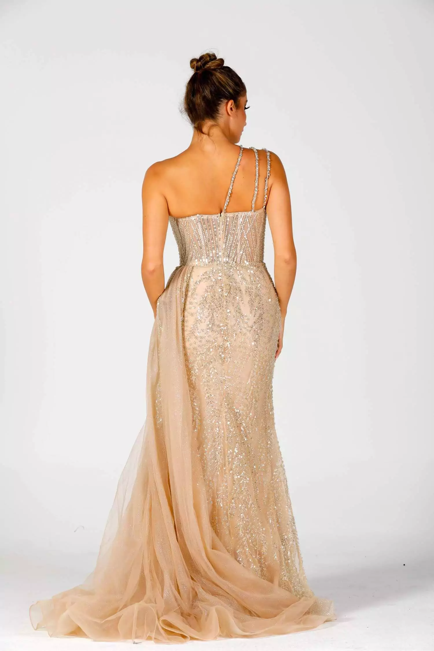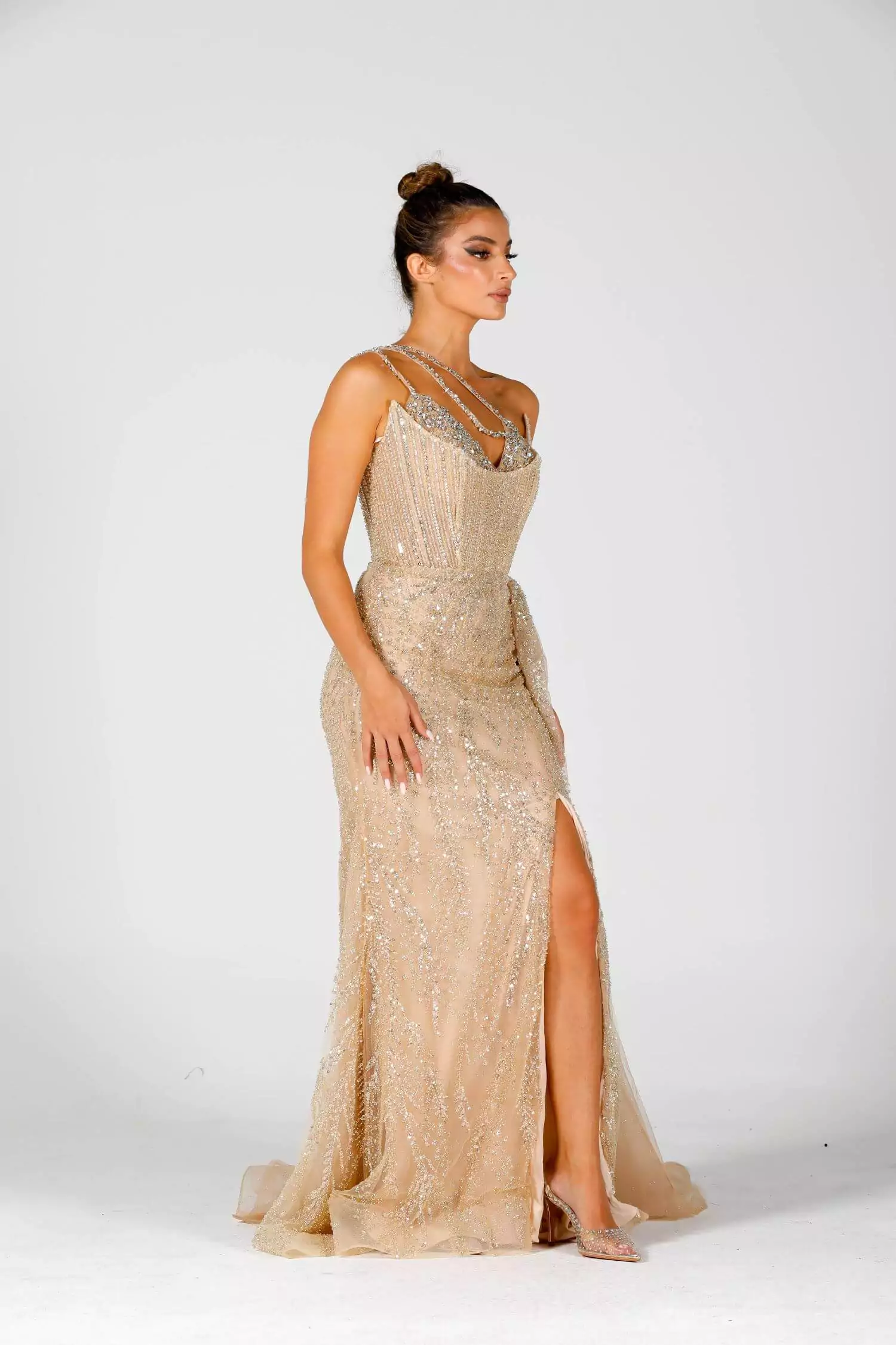 Step into elegance with the Aurelia dress, a masterpiece that combines golden luxury with modern sophistication. This champagne-hued dress features intricate beadwork and shimmering sequins that reflect light with every movement. The asymmetrical straps add a unique touch, while the floor-length design ensures graceful allure. Perfect for special occasions, this stunning piece will make you feel like you’re walking on air. Embrace timeless beauty and sophistication with Aurelia, the epitome of refined glamour. Step into elegance with the Aurelia dress, a masterpiece that combines golden luxury with modern sophistication. This champagne-hued dress features intricate beadwork and shimmering sequins that reflect light with every movement. The asymmetrical straps add a unique touch, while the floor-length design ensures graceful allure. Perfect for special occasions, this stunning piece will make you feel like you’re walking on air. Embrace timeless beauty and sophistication with Aurelia at Fostani One, the epitome of refined glamour.