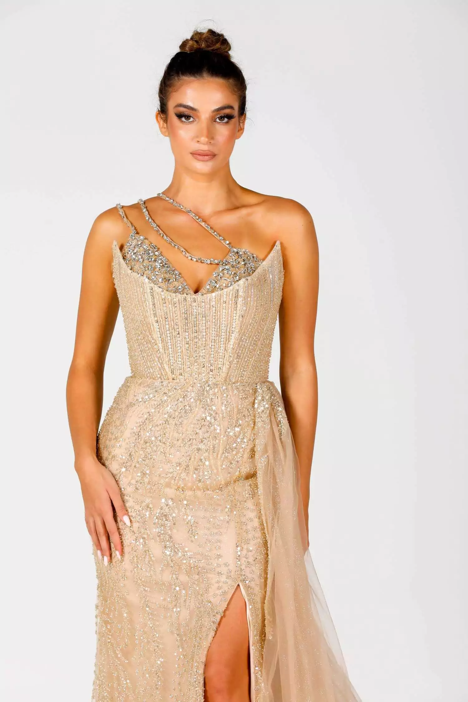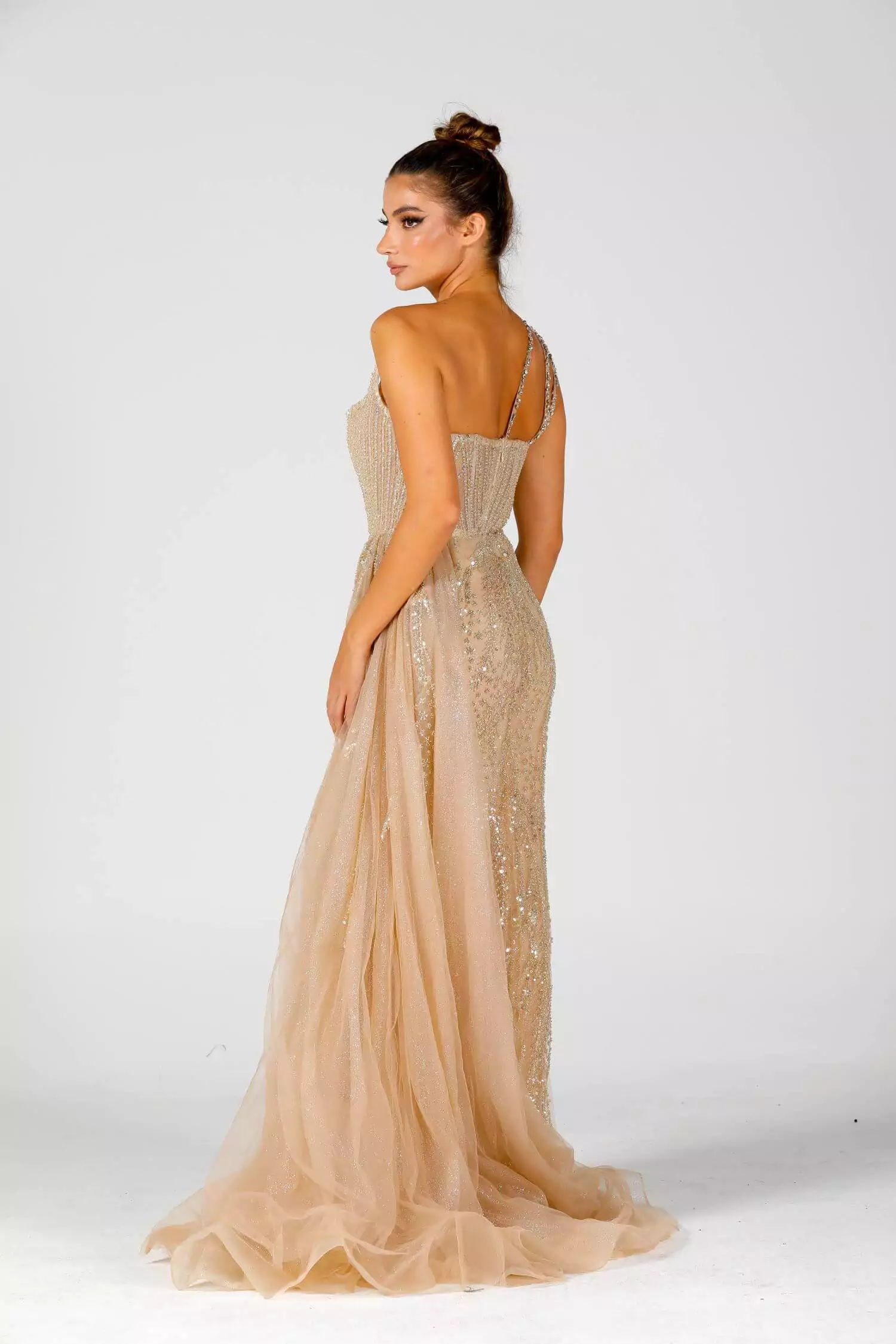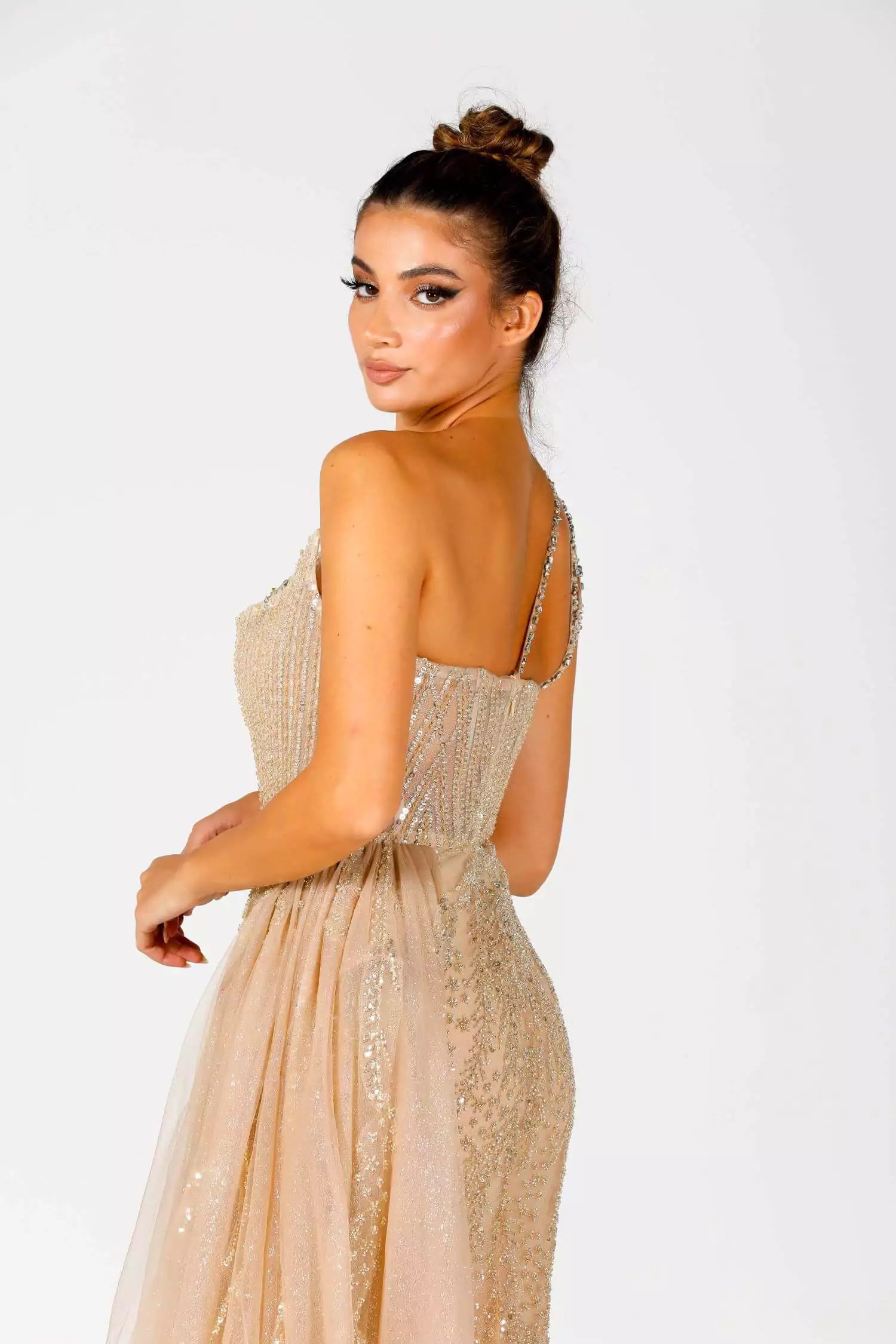 Step into elegance with the Aurelia dress, a masterpiece that combines golden luxury with modern sophistication. This champagne-hued dress features intricate beadwork and shimmering sequins that reflect light with every movement. The asymmetrical straps add a unique touch, while the floor-length design ensures graceful allure. Perfect for special occasions, this stunning piece will make you feel like you’re walking on air. Embrace timeless beauty and sophistication with Aurelia, the epitome of refined glamour. Step into elegance with the Aurelia dress, a masterpiece that combines golden luxury with modern sophistication. This champagne-hued dress features intricate beadwork and shimmering sequins that reflect light with every movement. The asymmetrical straps add a unique touch, while the floor-length design ensures graceful allure. Perfect for special occasions, this stunning piece will make you feel like you’re walking on air. Embrace timeless beauty and sophistication with Aurelia at Fostani One, the epitome of refined glamour.