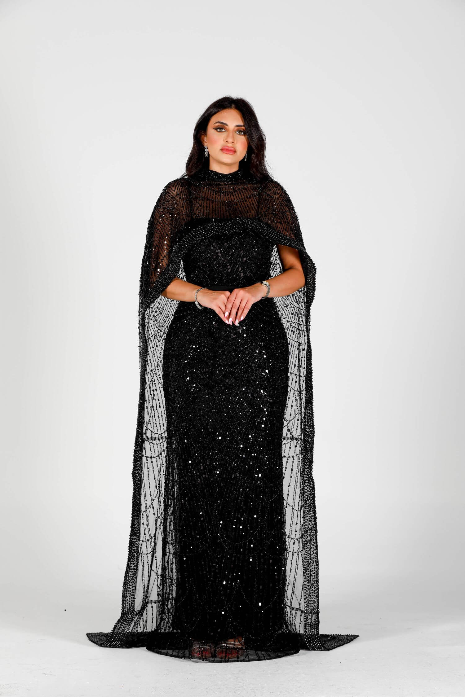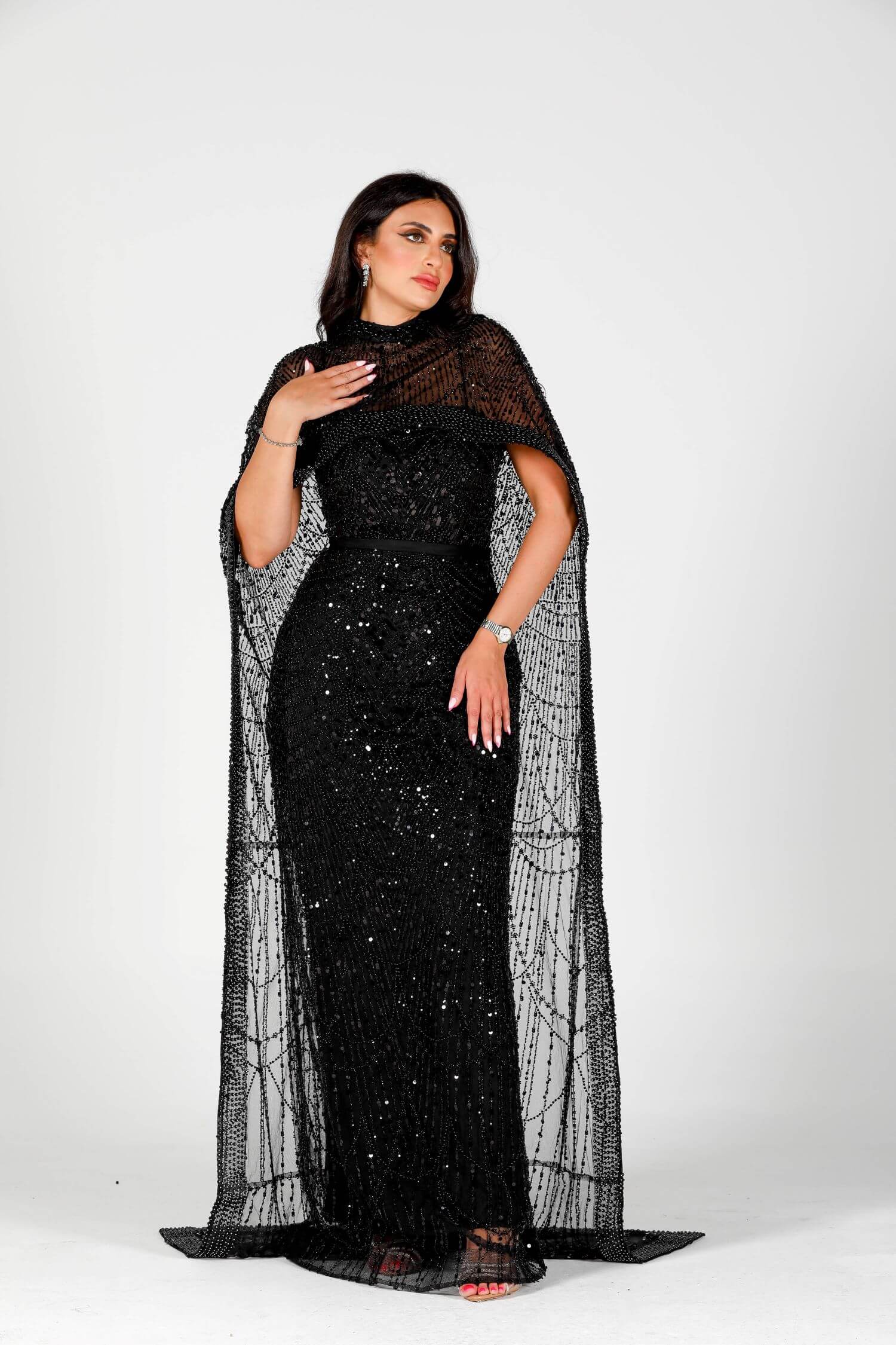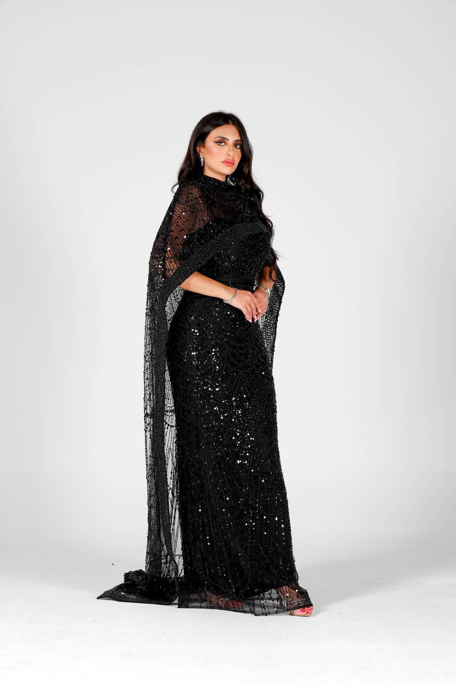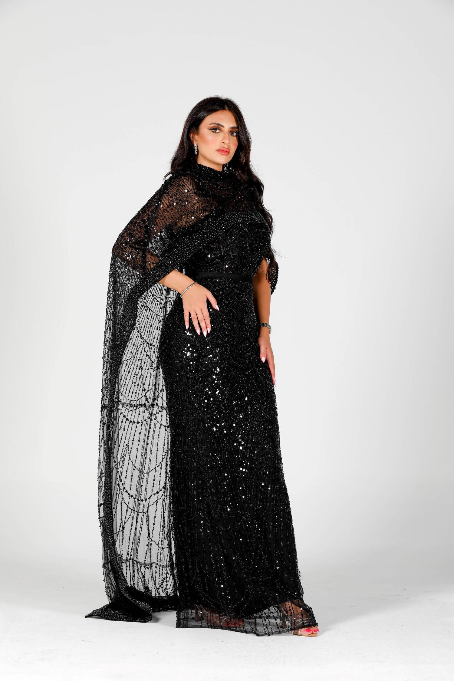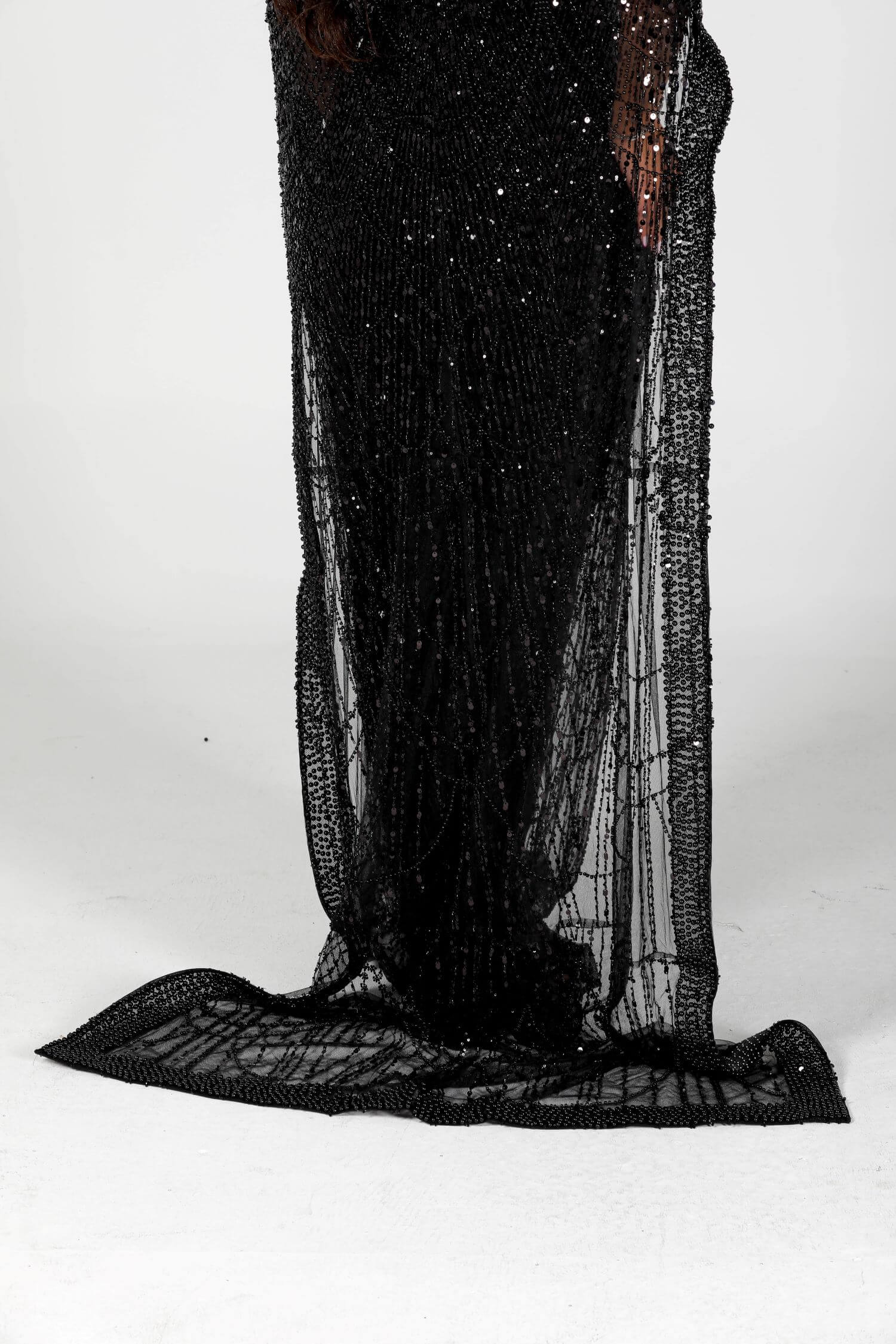 Step into the spotlight with the Eclipse dress, a luxurious masterpiece crafted for bold elegance. This black sequin-embellished dress features intricate beadwork and a dramatic sheer overlay, embodying grace and sophistication. The flowing cape-like design drapes elegantly around your figure, creating a striking silhouette. Perfect for evening events or formal gatherings, this dress is your ultimate statement piece. Embrace the allure of mystery and style with this exquisite creation.