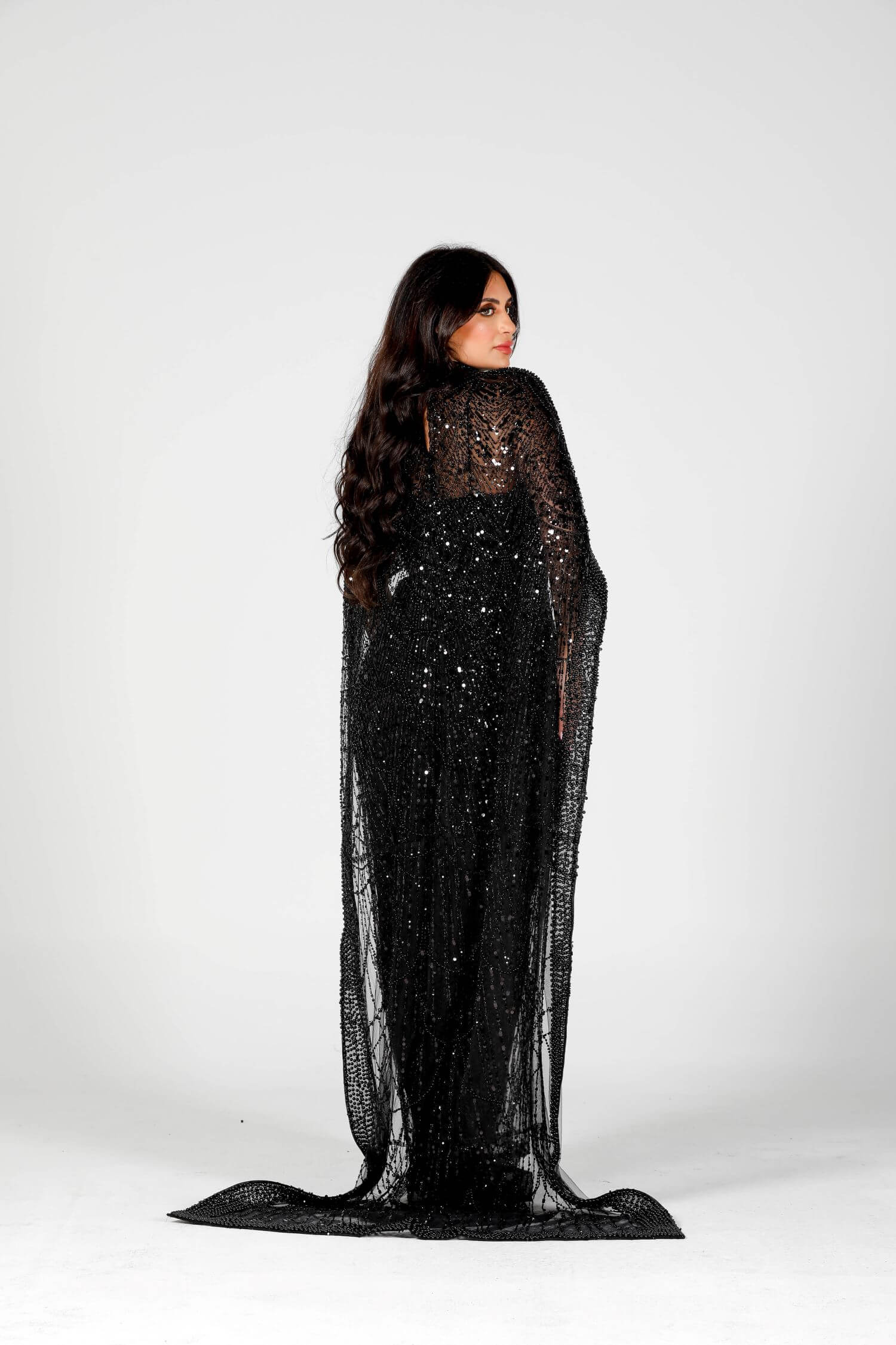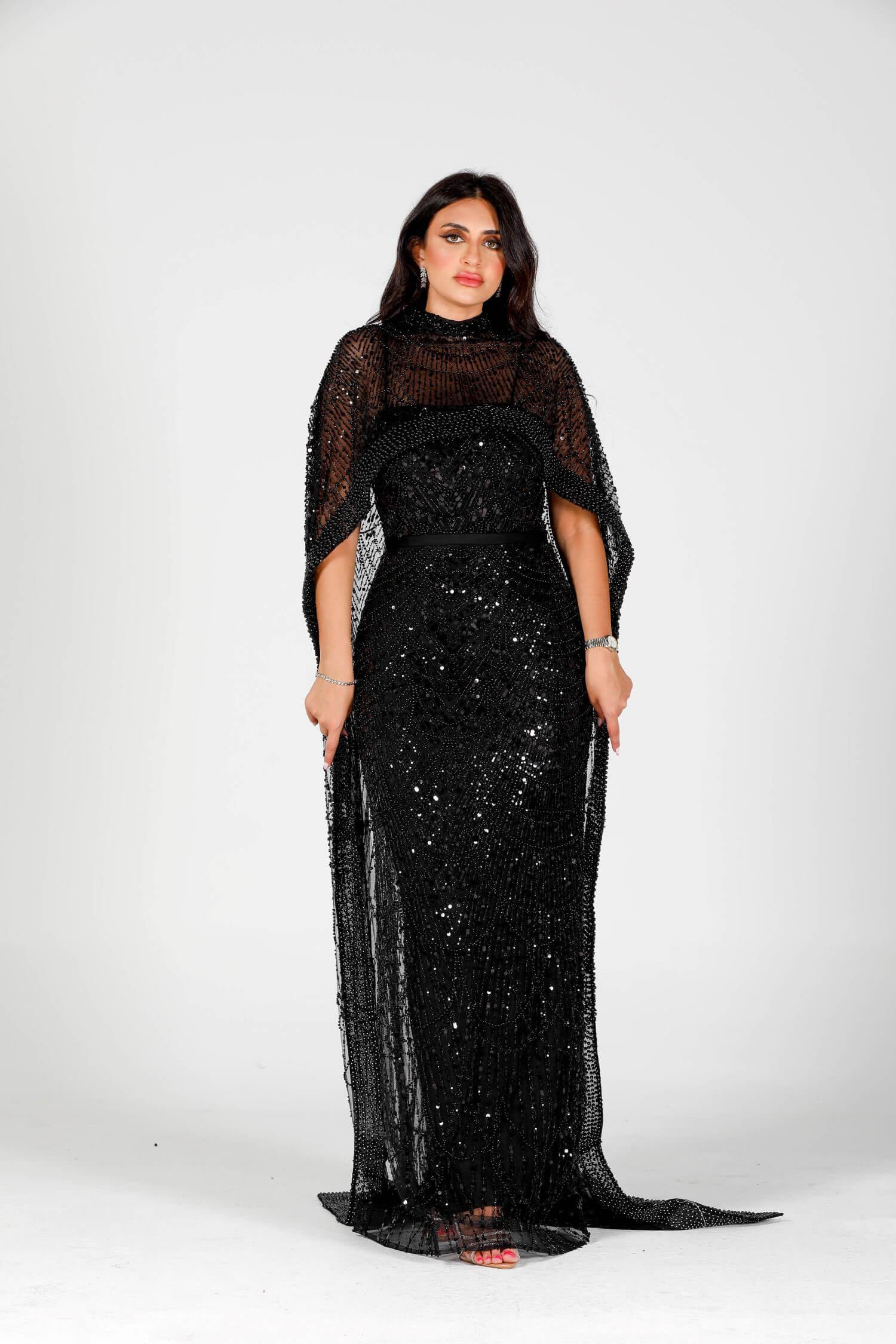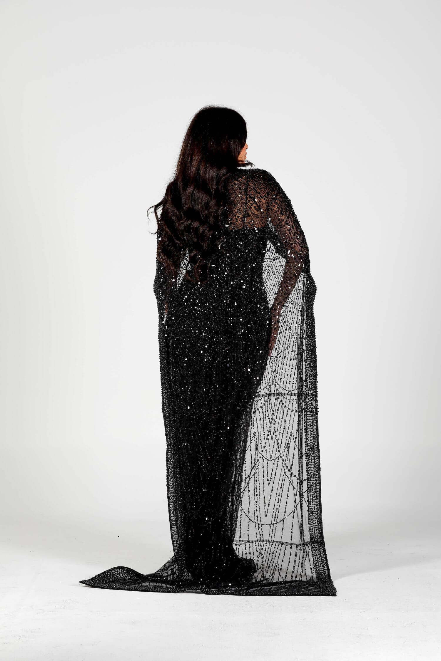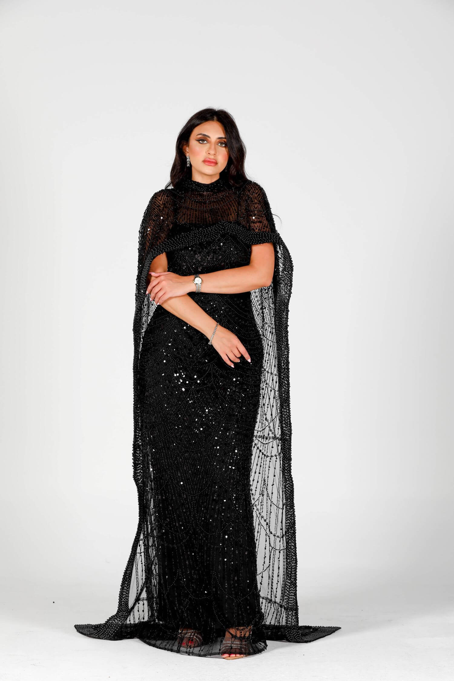 Step into the spotlight with the Eclipse dress, a luxurious masterpiece crafted for bold elegance. This black sequin-embellished dress features intricate beadwork and a dramatic sheer overlay, embodying grace and sophistication. The flowing cape-like design drapes elegantly around your figure, creating a striking silhouette. Perfect for evening events or formal gatherings, this dress is your ultimate statement piece. Embrace the allure of mystery and style with this exquisite creation.