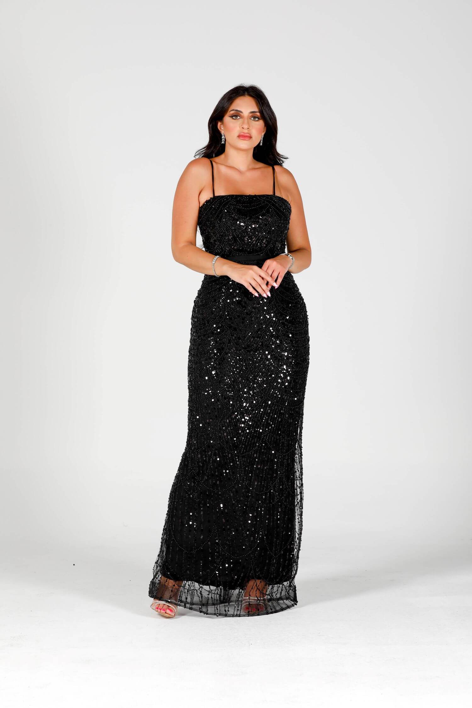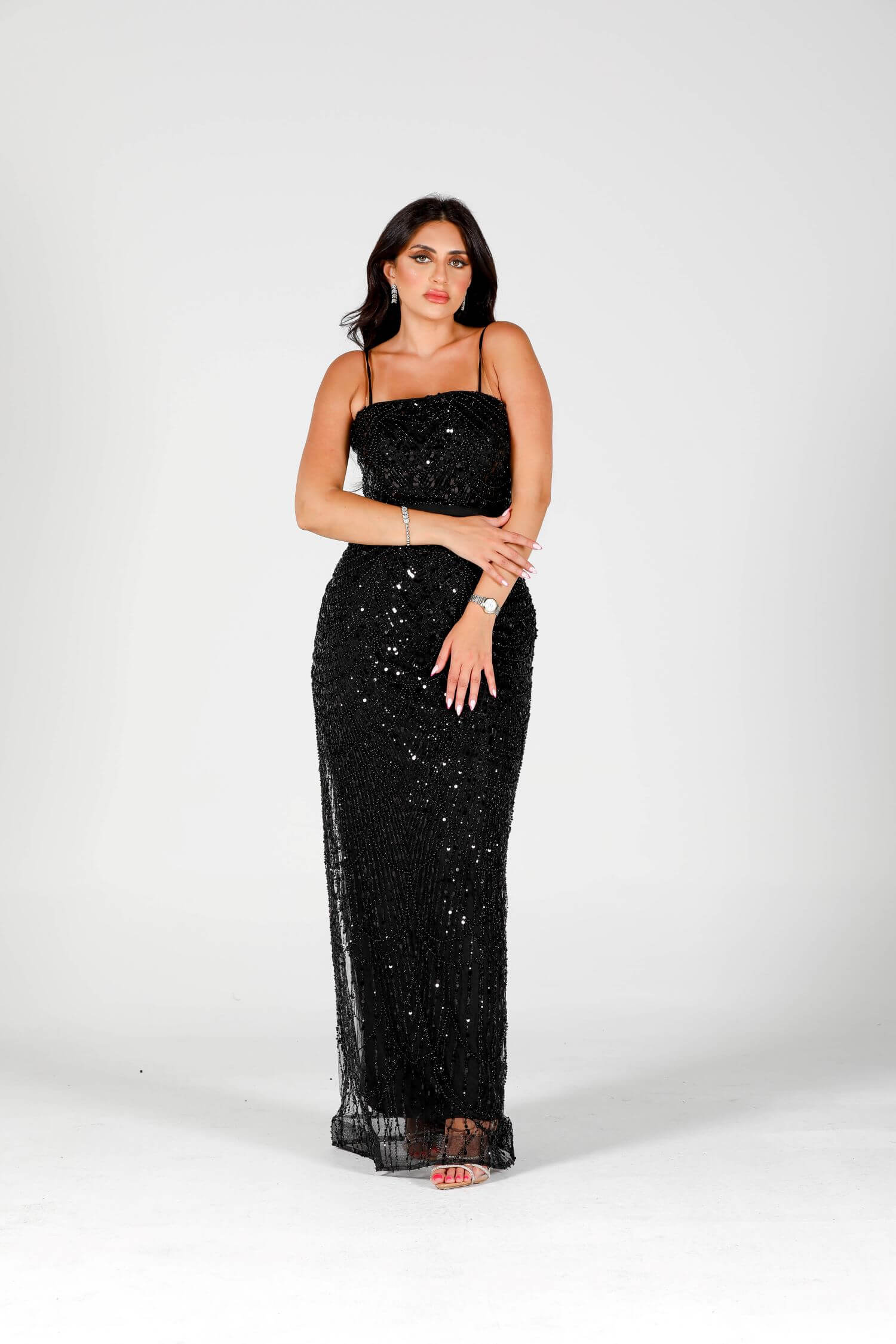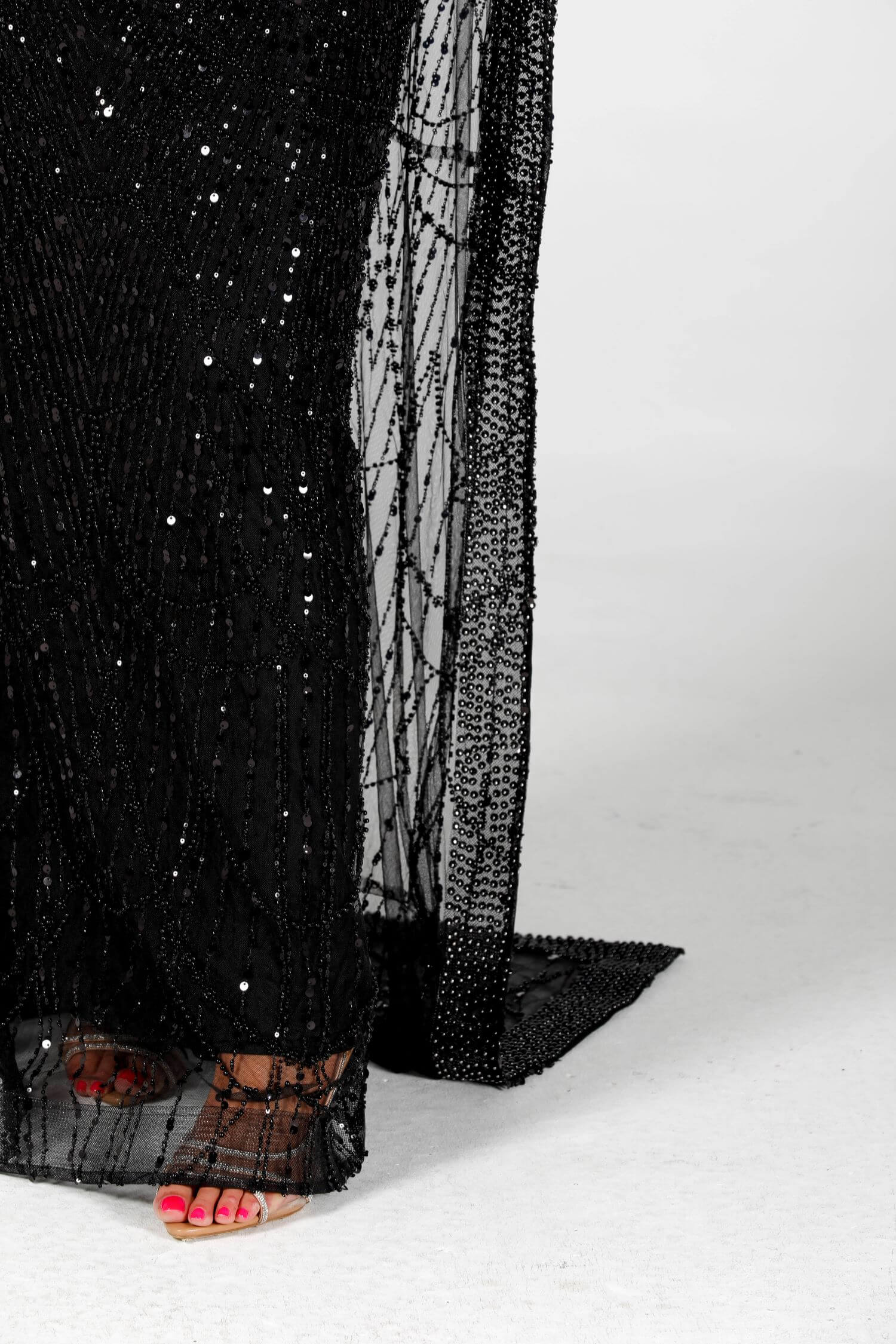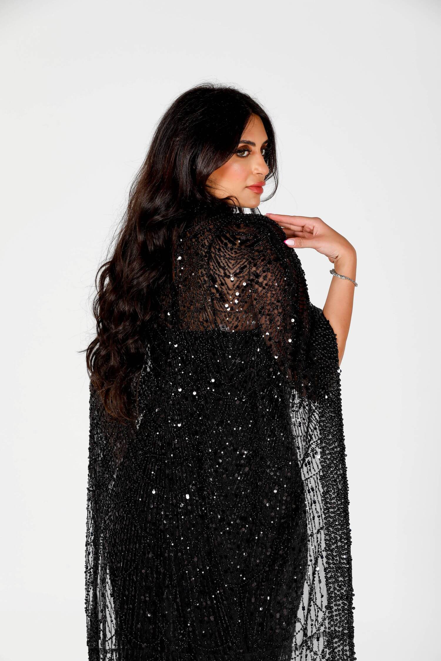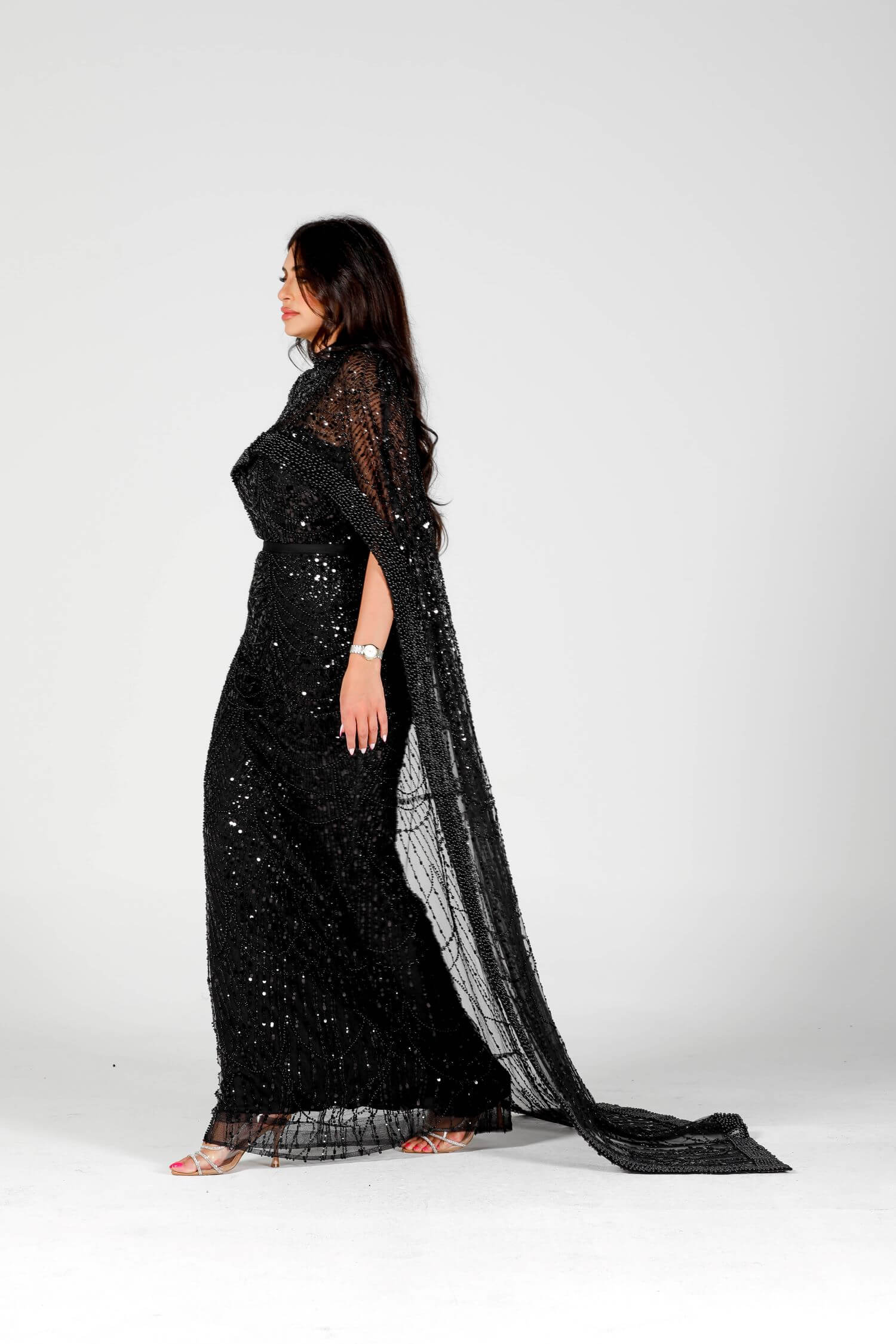 Step into the spotlight with the Eclipse dress, a luxurious masterpiece crafted for bold elegance. This black sequin-embellished dress features intricate beadwork and a dramatic sheer overlay, embodying grace and sophistication. The flowing cape-like design drapes elegantly around your figure, creating a striking silhouette. Perfect for evening events or formal gatherings, this dress is your ultimate statement piece. Embrace the allure of mystery and style with this exquisite creation.