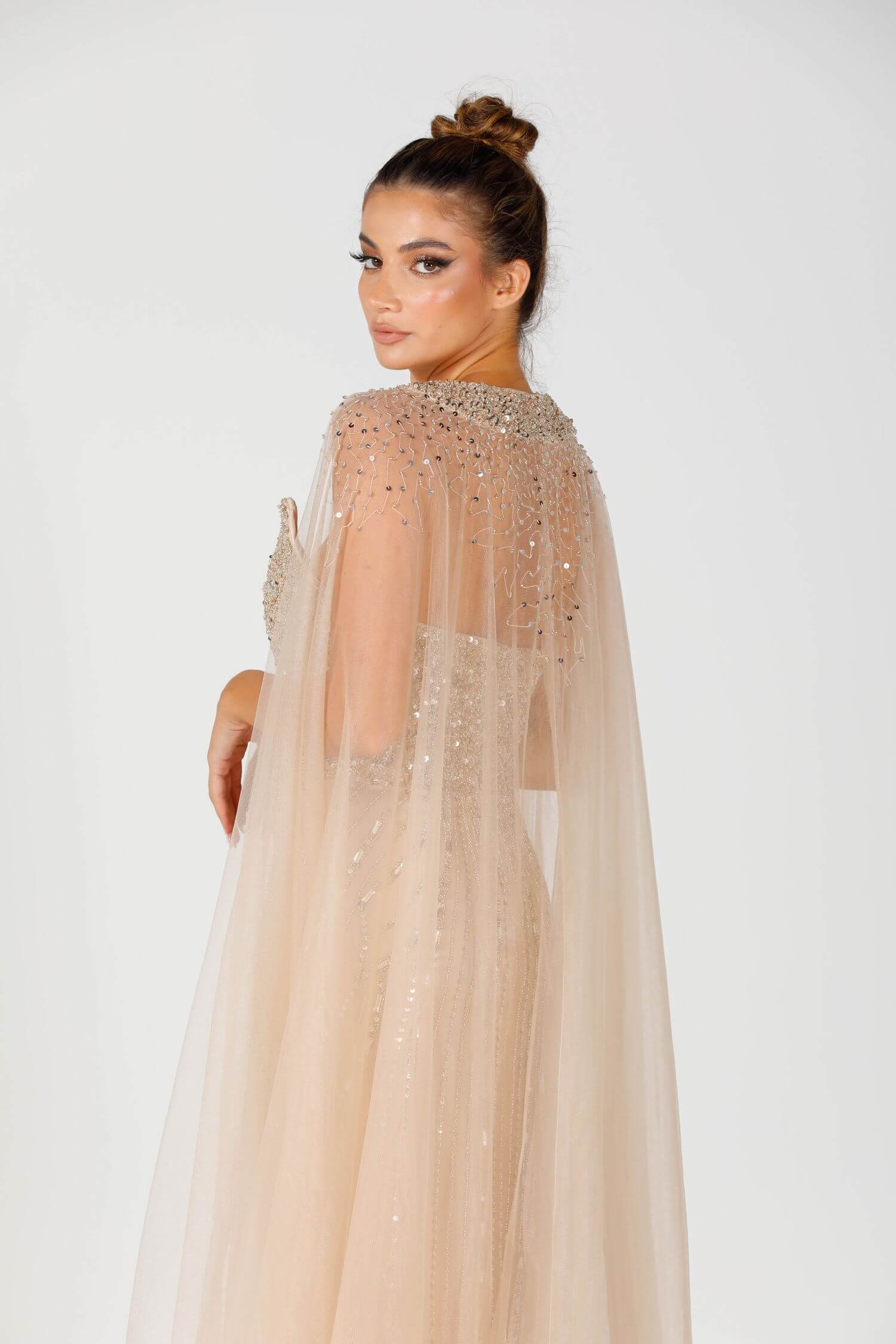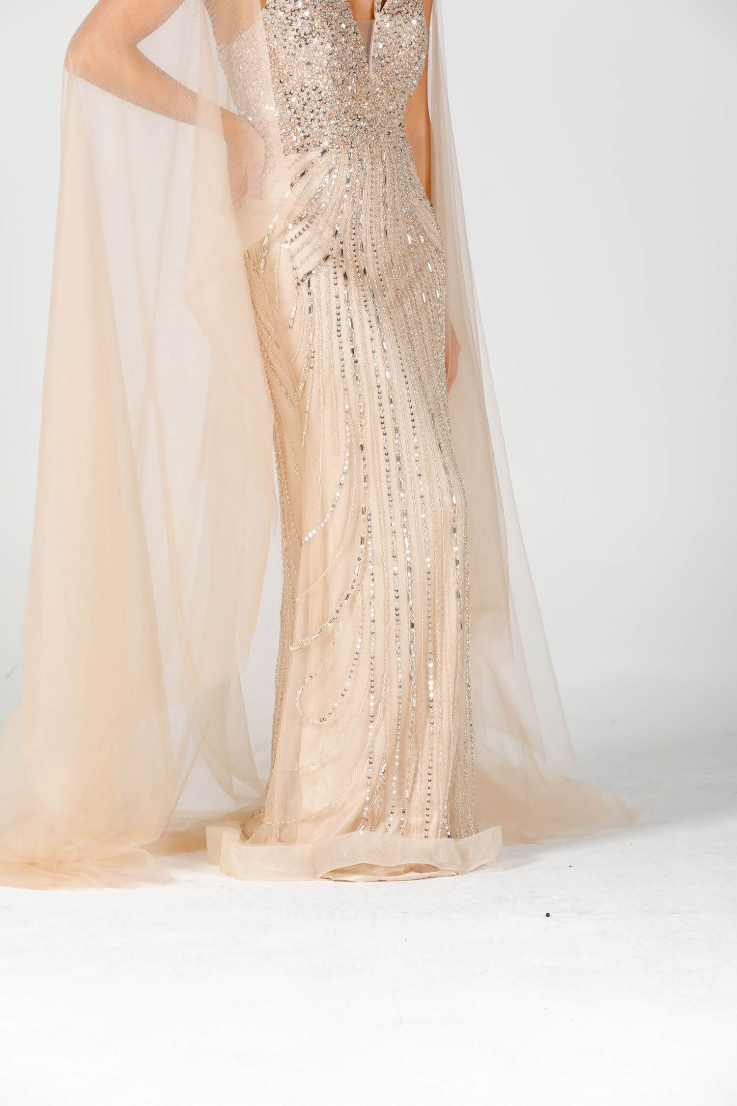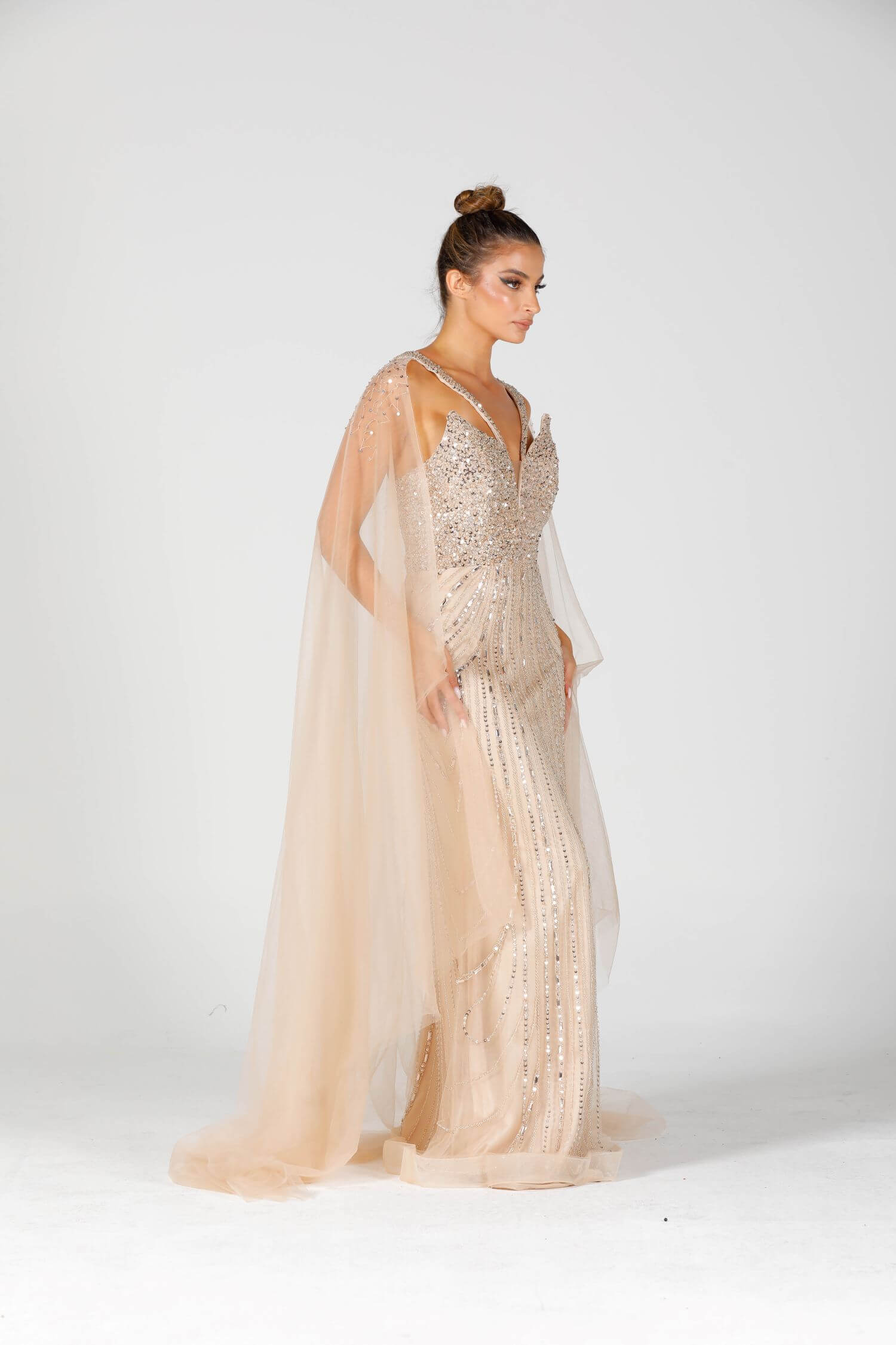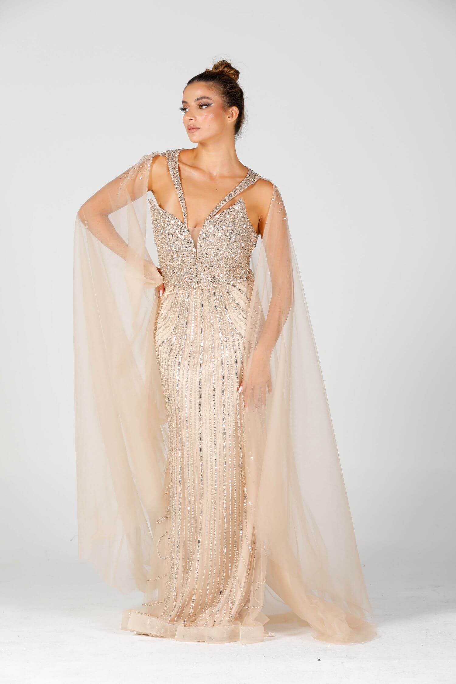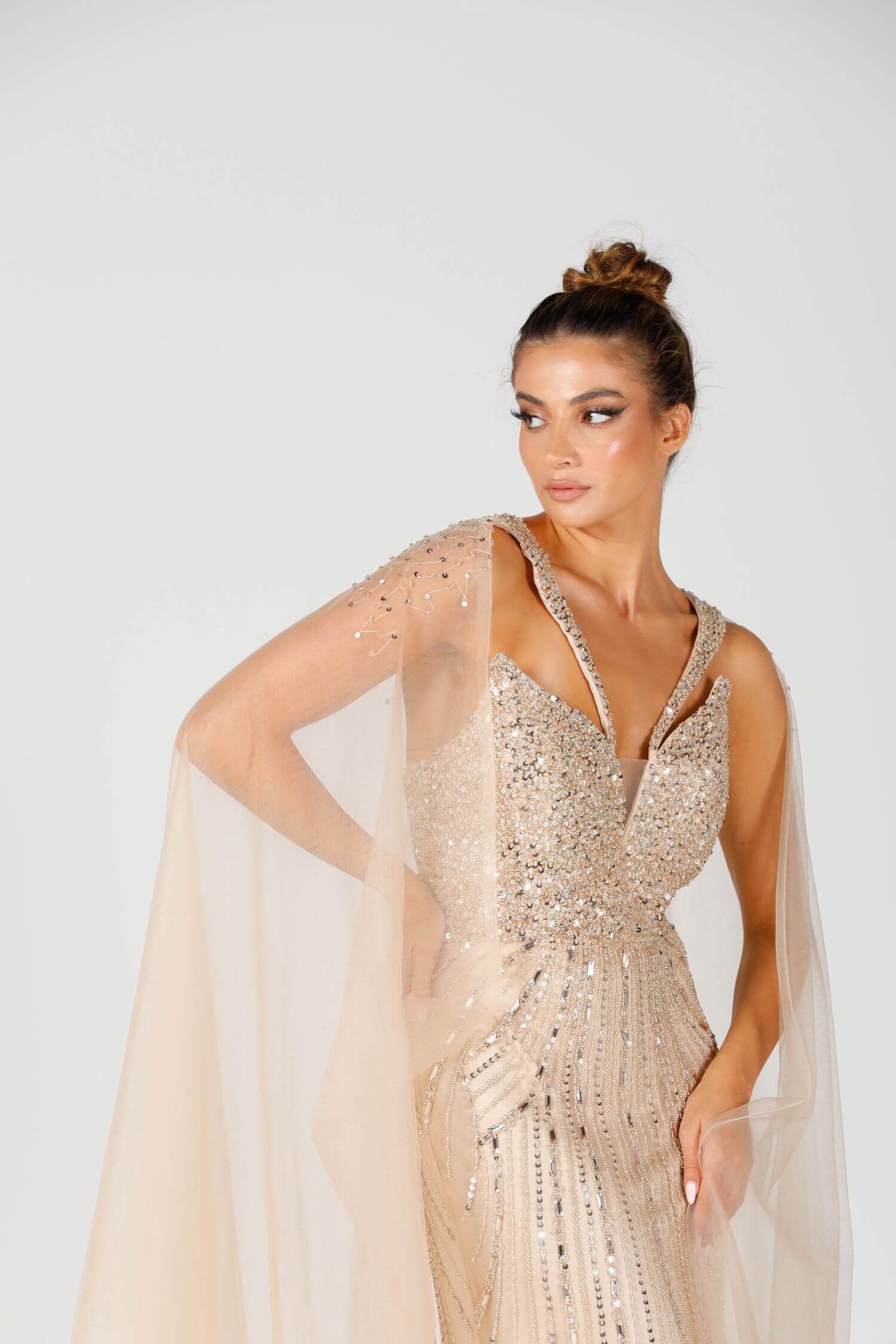 Step into timeless elegance with this gold-sequined masterpiece, designed to captivate with its intricate beadwork and flowing cape. The exquisite details around the shoulders shimmer with every move, making this dress a perfect statement for grand events. The fitted silhouette is complemented by luxurious fabric that enhances the figure, while the beaded cape adds an ethereal touch. Ideal for those seeking an unforgettable look, this dress embodies grace and sophistication, turning heads at any occasion.