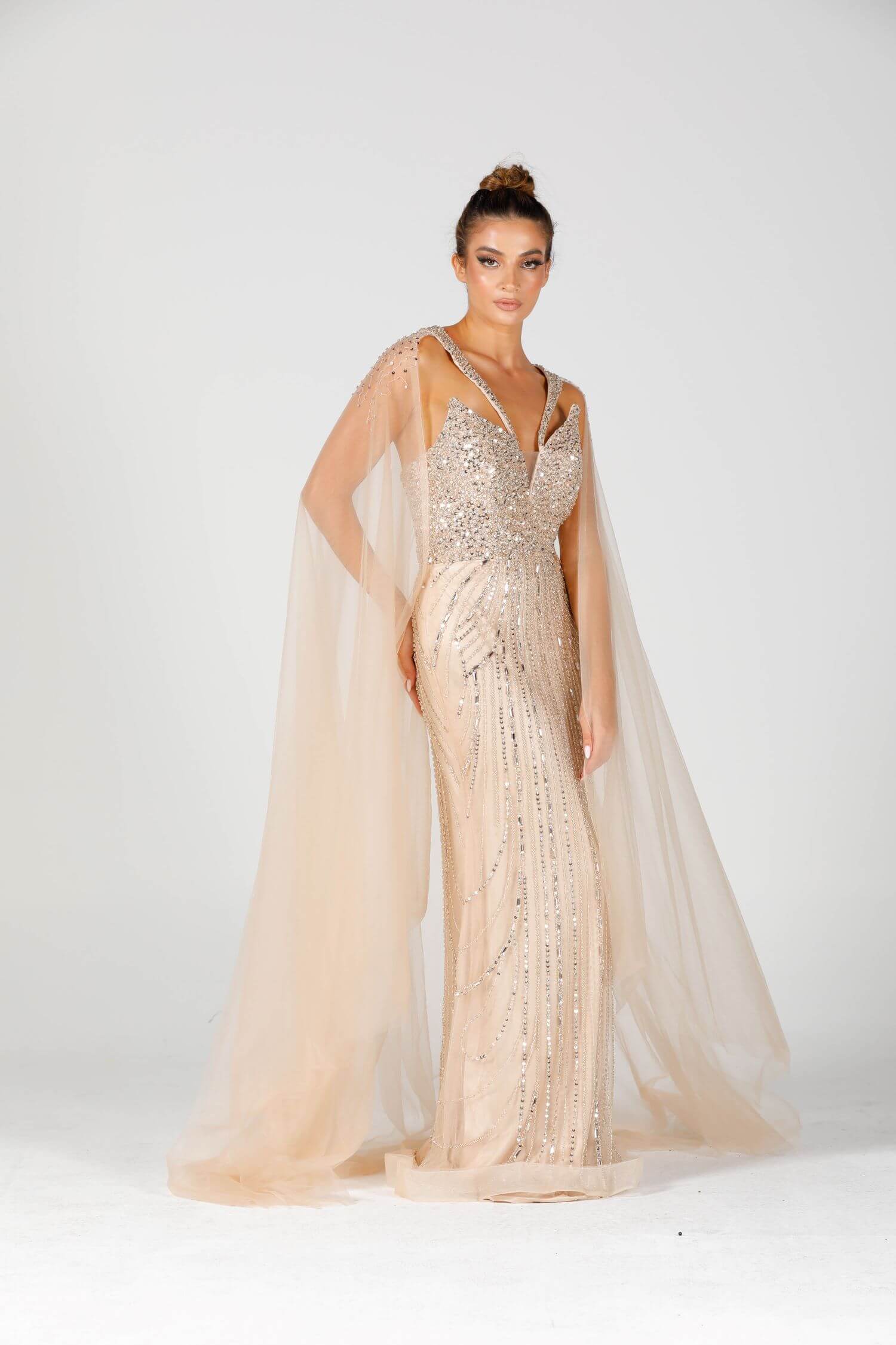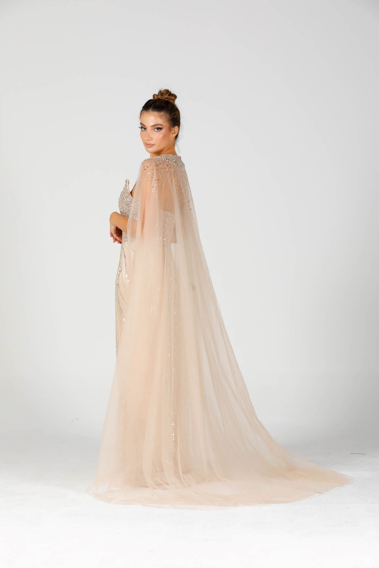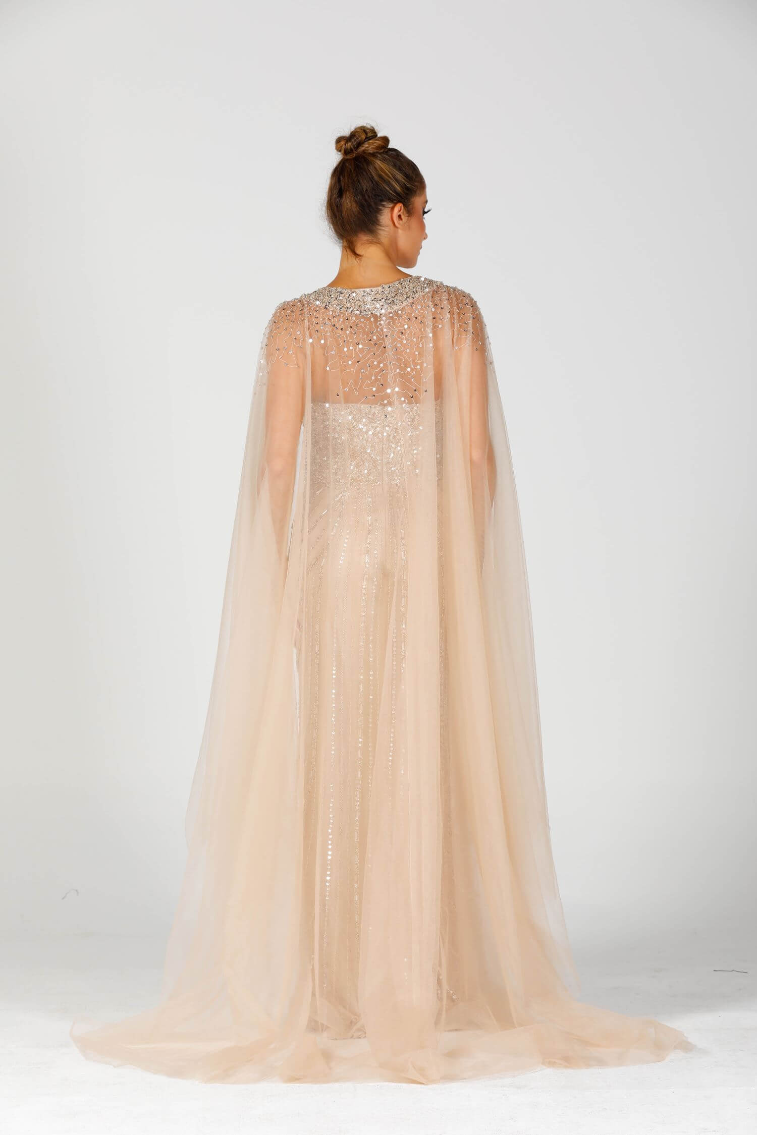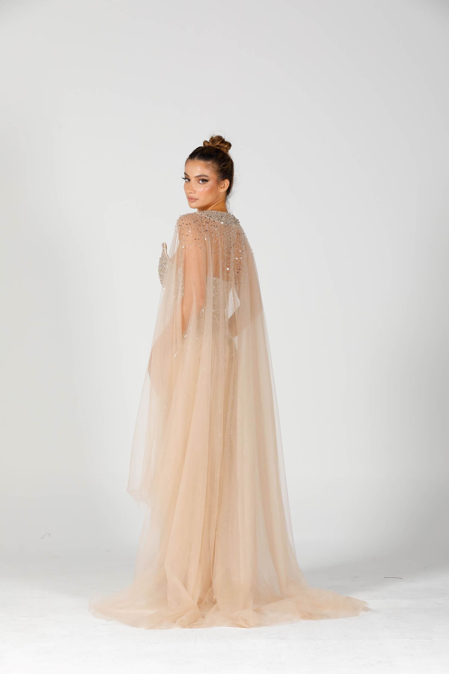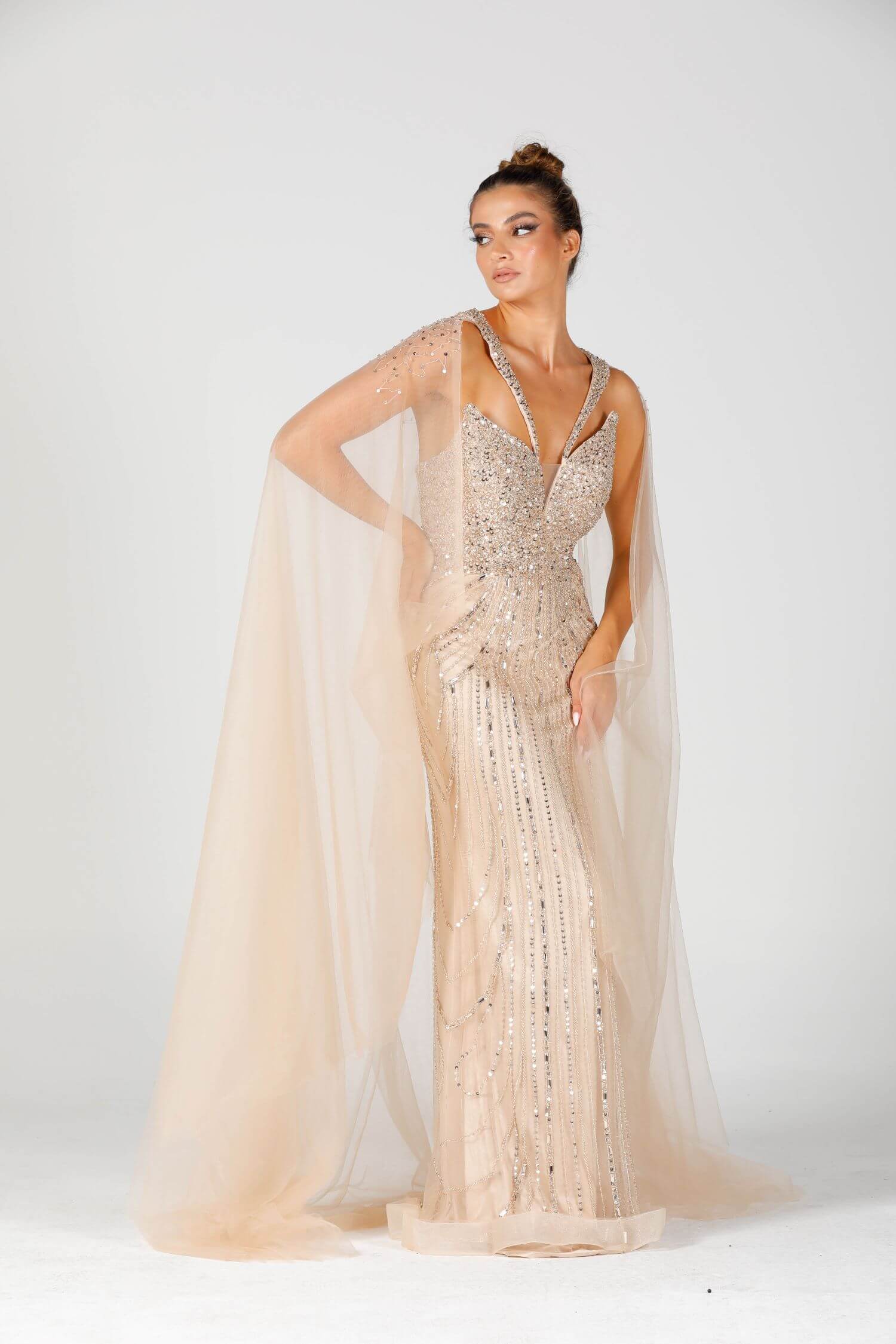 Step into timeless elegance with this gold-sequined masterpiece, designed to captivate with its intricate beadwork and flowing cape. The exquisite details around the shoulders shimmer with every move, making this dress a perfect statement for grand events. The fitted silhouette is complemented by luxurious fabric that enhances the figure, while the beaded cape adds an ethereal touch. Ideal for those seeking an unforgettable look, this dress embodies grace and sophistication, turning heads at any occasion.