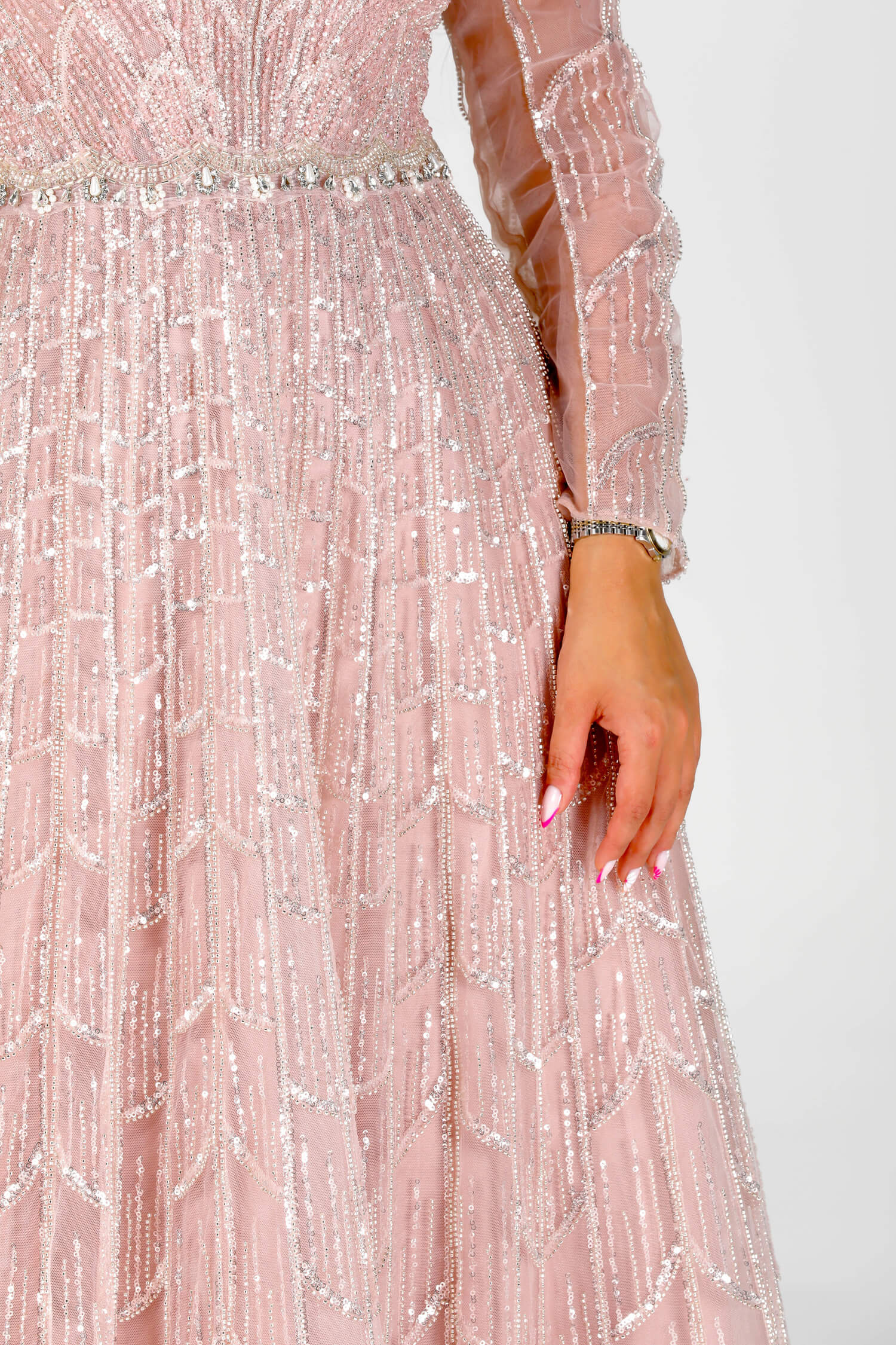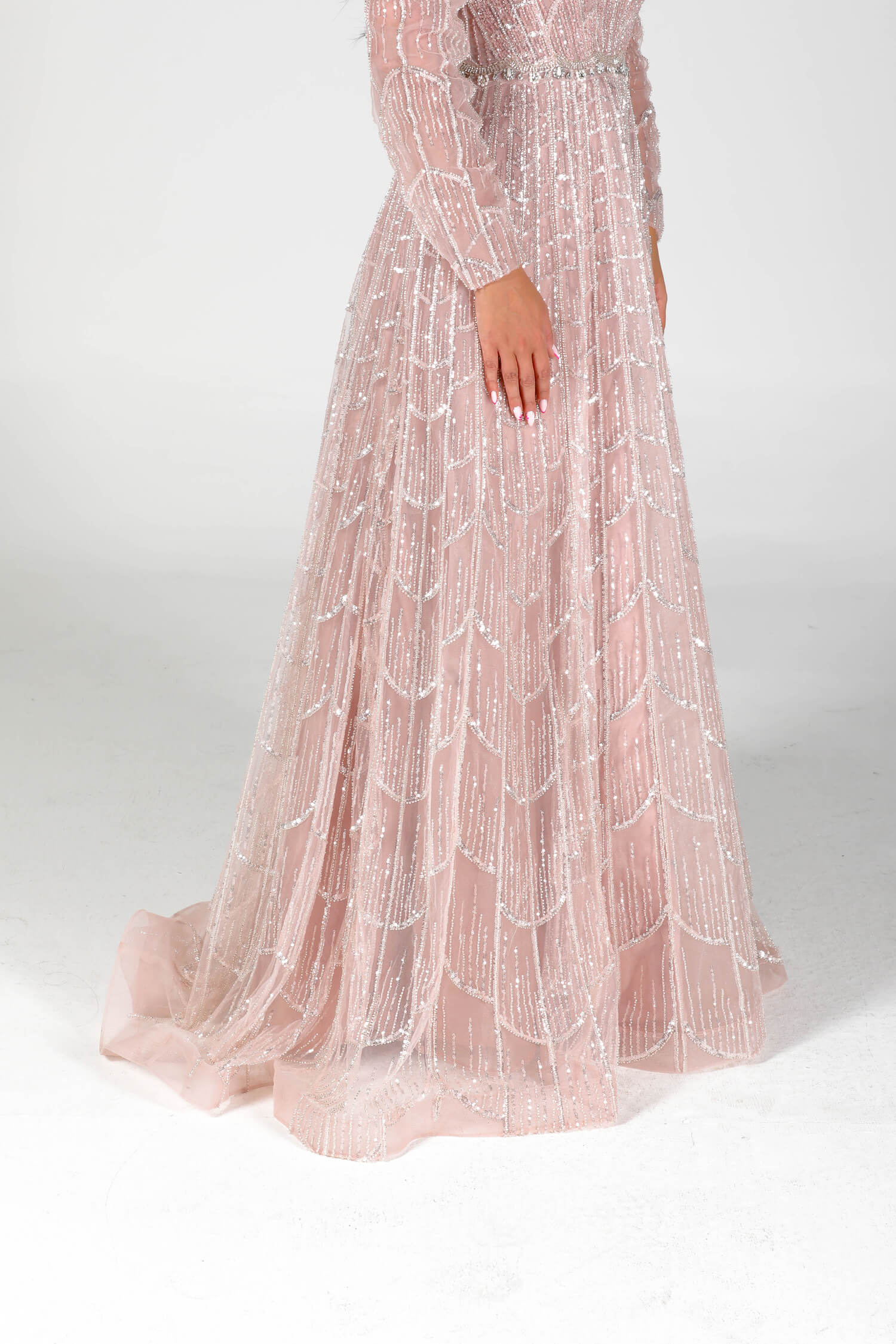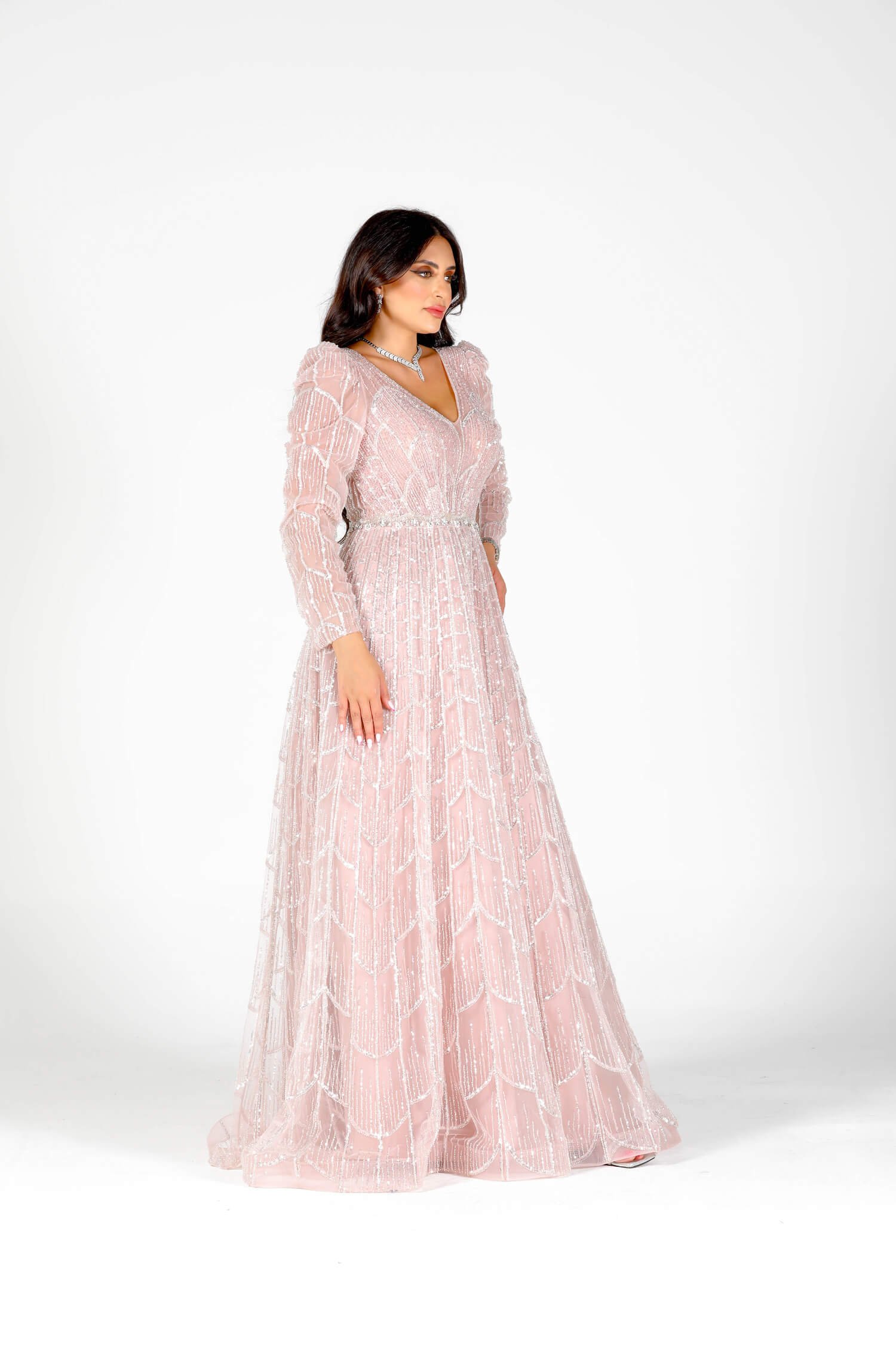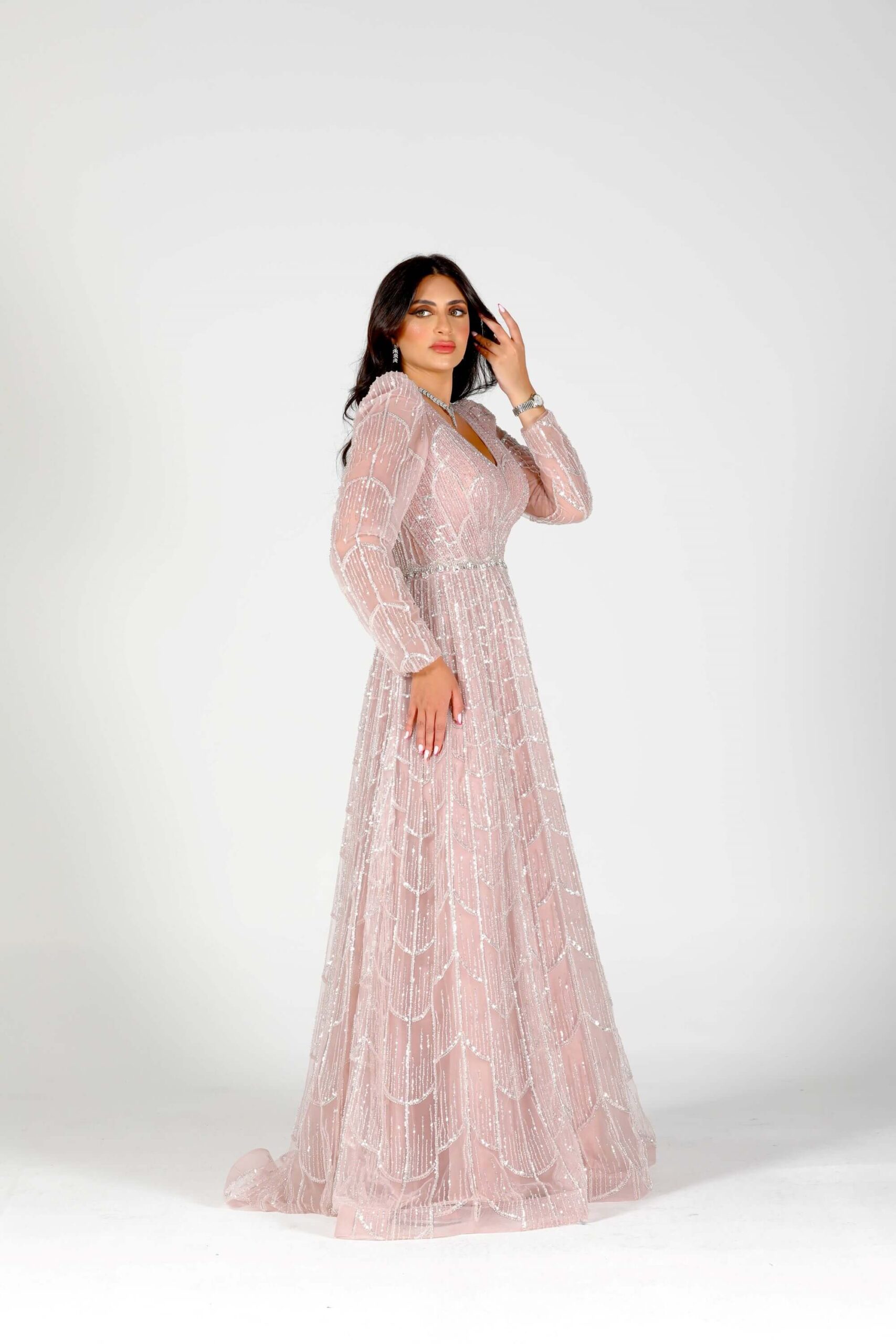 Subtle pleating at the waist and a sweeping train complete the look, creating movement and flow with every step. Designed for black-tie events, weddings, or exclusive celebrations, this dress balances classic charm with fashion-forward flair.