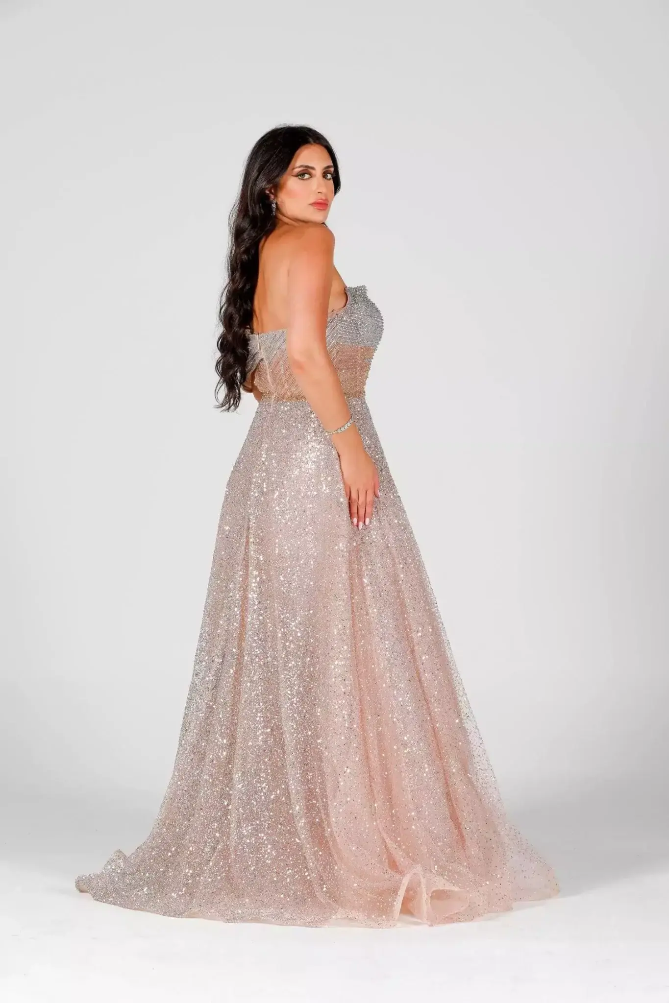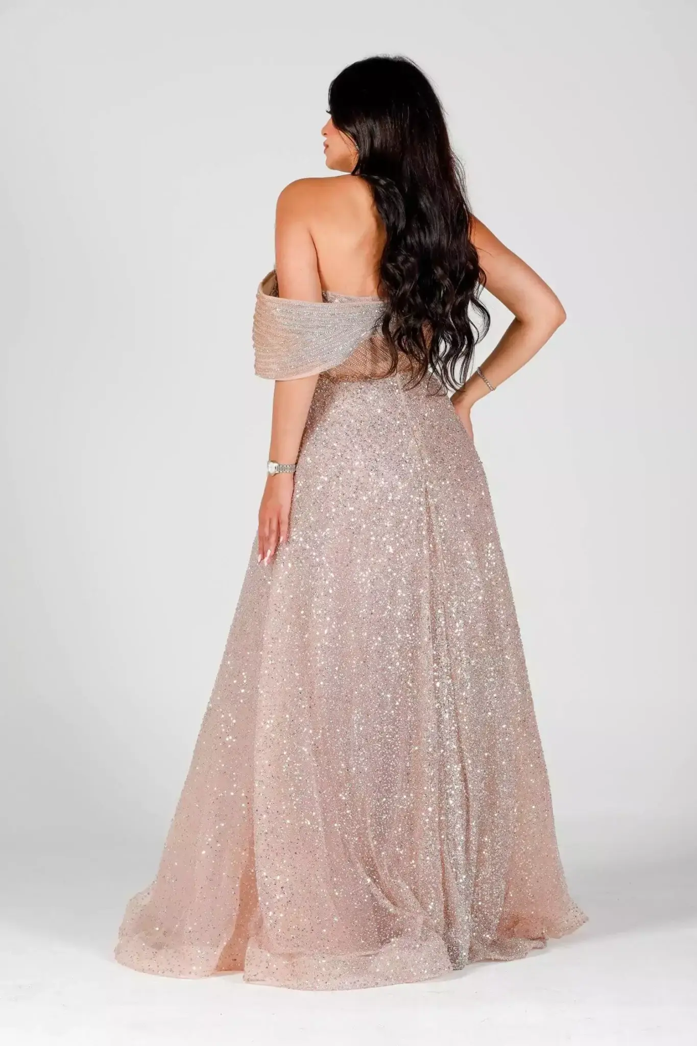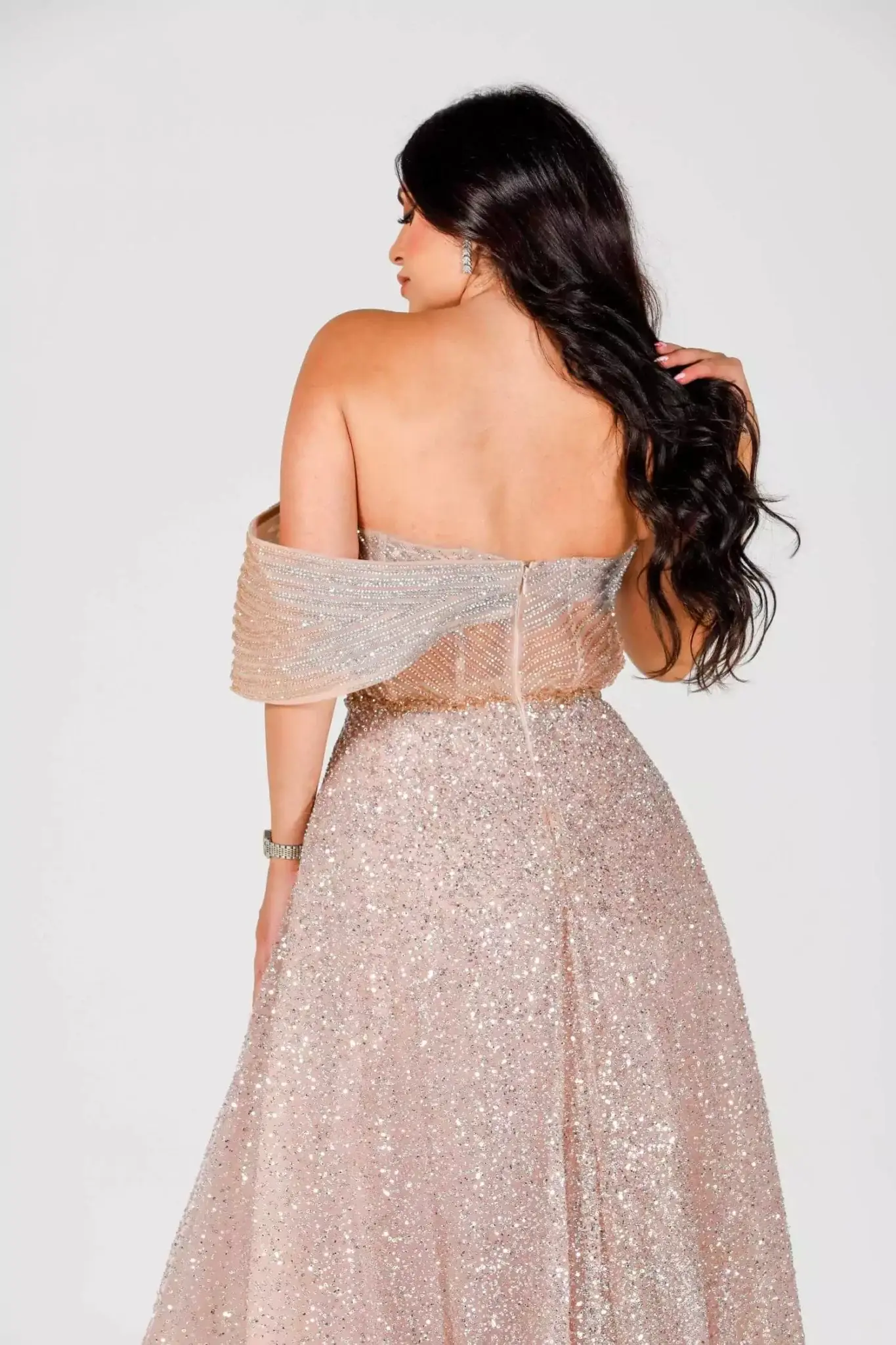 Step into pure sophistication with Magnifique, the ultimate expression of evening glamour. Designed for the modern woman who embraces elegance and confidence, this exquisite gown is tailored to make you feel truly unforgettable. Whether you're attending a gala, a red-carpet event, or an exclusive soirée, the bold charm of it guarantees a grand entrance. Luxurious Design Meets Flawless Detail Crafted from premium fabric with a delicate shimmer, it flows gracefully with every step. The silhouette hugs your curves in all the right places, while a dramatic train and intricate embellishments elevate the gown to couture status. From the rich color palette to the expertly sewn detailing, every inch of it speaks luxury. The deep V-neckline and elegant open back balance boldness and sophistication, allowing you to turn heads from every angle. Whether paired with statement heels or classic jewelry, this dress empowers you to shine with unmatched poise. Why Choose Magnifique by Fostani One? Exclusive design, only available at Fostani One Perfect for weddings, red carpet, and formal events Available in multiple sizes for a flawless fit