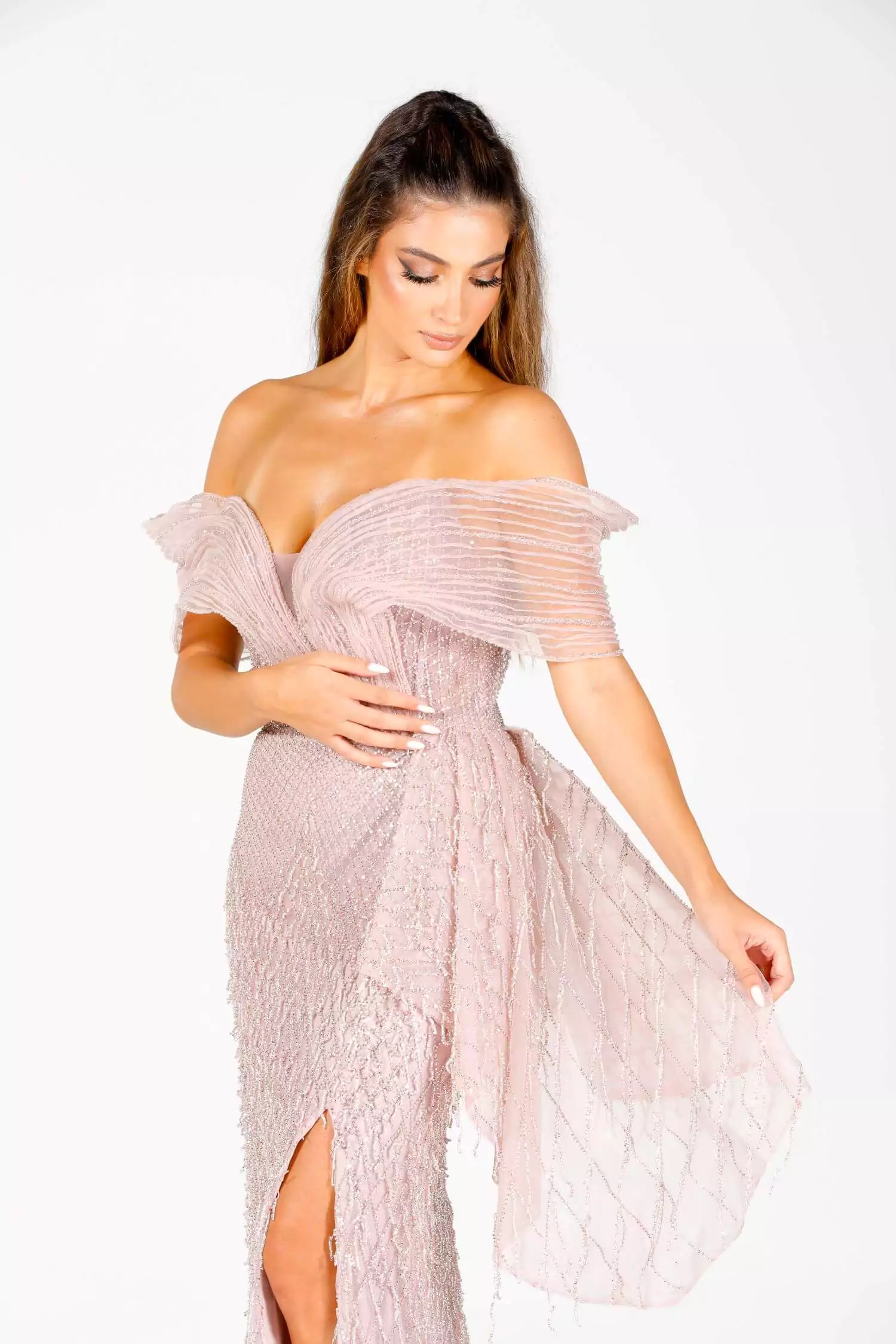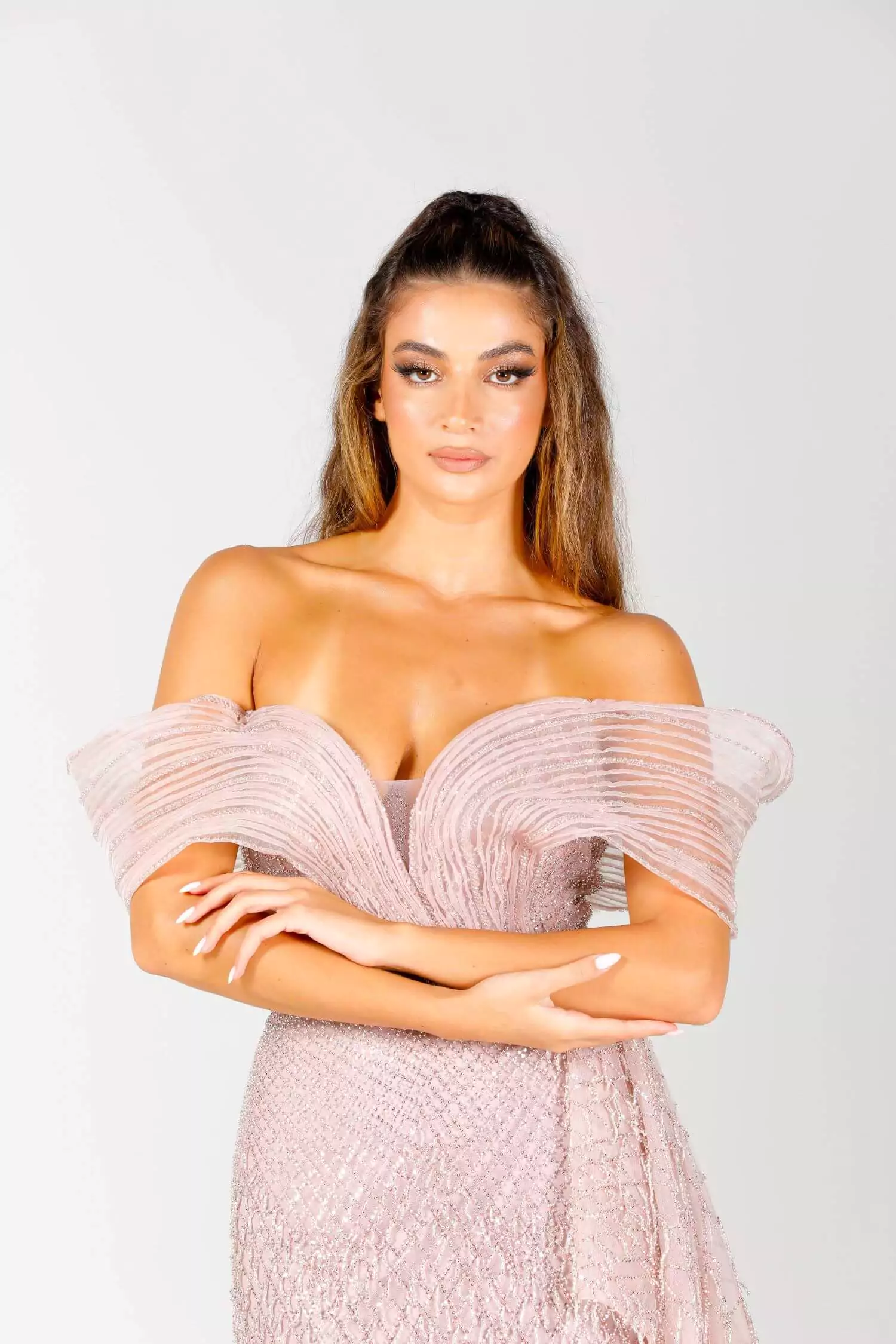 Step into a world of timeless beauty with Rosabella, a gown crafted to embody grace, charm, and feminine sophistication. With its romantic silhouette and delicate detailing, this dress is made for women who dream in couture and live for magical evenings. Delicate Design, Powerful Presence This gown features soft, flowing layers of tulle that create movement with every step. Its blush-toned fabric glows softly under the light, while floral appliqués delicately cascade down the bodice and skirt. A sweetheart neckline and off-the-shoulder sleeves frame the figure beautifully, creating a look that is both romantic and regal. Designed to highlight natural elegance, Rosabella flatters the body without overpowering it. The structured waistline and sweeping train ensure a flawless silhouette that is as photogenic as it is breathtaking in person. Whether worn to a wedding, gala, or exclusive soirée, this dress turns every moment into a memory.